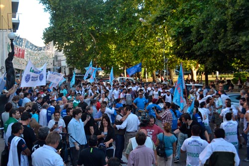 Desde la perspectiva, tanto la plaza Belgrano como la puerta del Palacio Municipal son lugares de disputa por el poder político, son “la calle” que se disputan las organizaciones políticamente activas. Allí suelen realizarse protestas y reclamos por motivos políticos y sociales; agrupándose en la calle y la plaza Colón (frente a la municipalidad) e instalando un lugar de oratoria y discurso en las escalinatas del palacio. En las cercanías de ese lugar, en la esquina (calles Colón y San Martín) se llevan a cabo festejos políticos, deportivos, estudiantiles, entre otros, resultando un punto de encuentro social para eventos puntuales que está en proceso de transformación con la instauración de la plazoleta Antigua Estación Basílica como epicentro de las actividades juveniles.